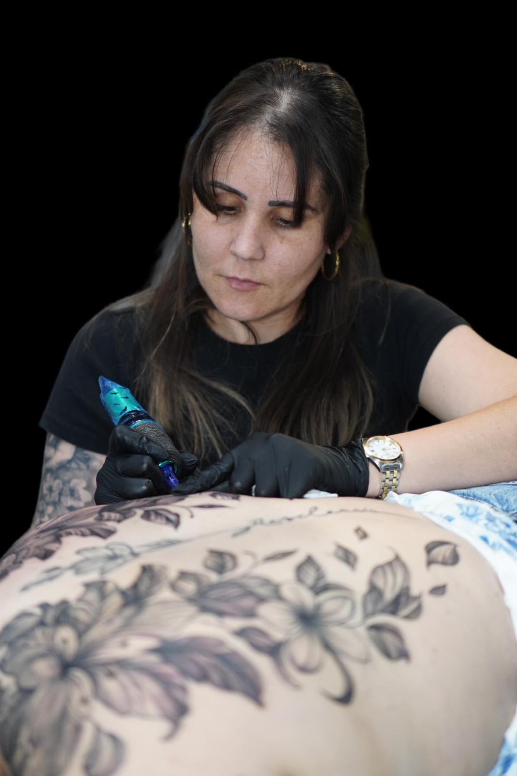 Su especialidad es el realismo, tanto en color como en black & grey, pero también domina estilos como fine line, geométrico, blackwork y mucho más.